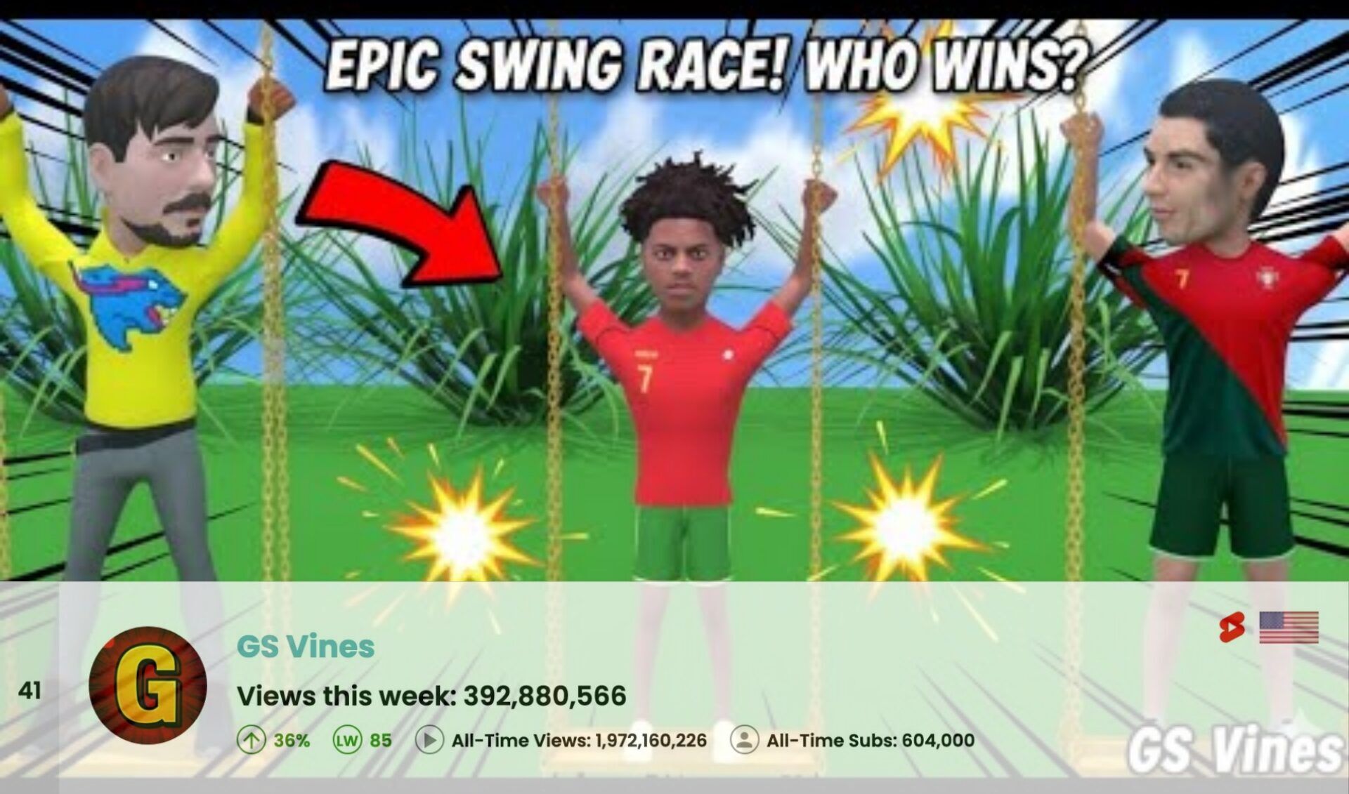 The channel: Just this week, a channel called GS Vines made its first appearance in our Global Top 50 after collecting 392.8 million weekly views. The catch: GS Vines isn't actually aggregating clips that originated on the titular video app or even emulating the app's signature six-second format. Instead, animated Shorts like this one feature popular figures—like Cristiano Ronaldo—who have little (if any relationship) to Vine. |
