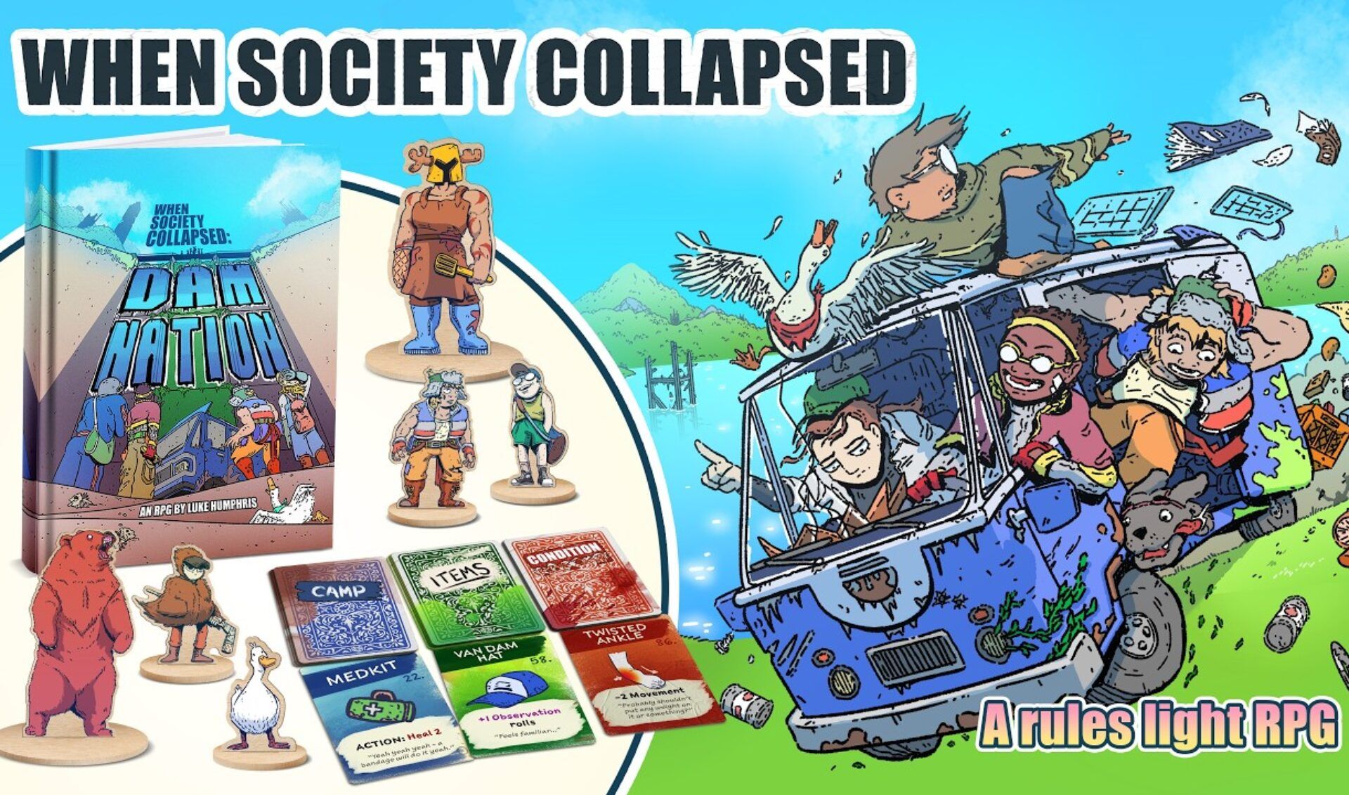 Called When Society Collapsed: Dam Nation, Humphris' homebrewed world is a cozy post-apocalyptic journey that's light on rules and heavy on team exploration. Folks who join in the Kickstarter get a 150+ page book explaining the world's lore, class system, and guidelines. Also included on higher tiers ($99+) are props like regional and encounter maps, wooden minifigures, and a pop-up "battle van" that serves as players' mobile hub. |